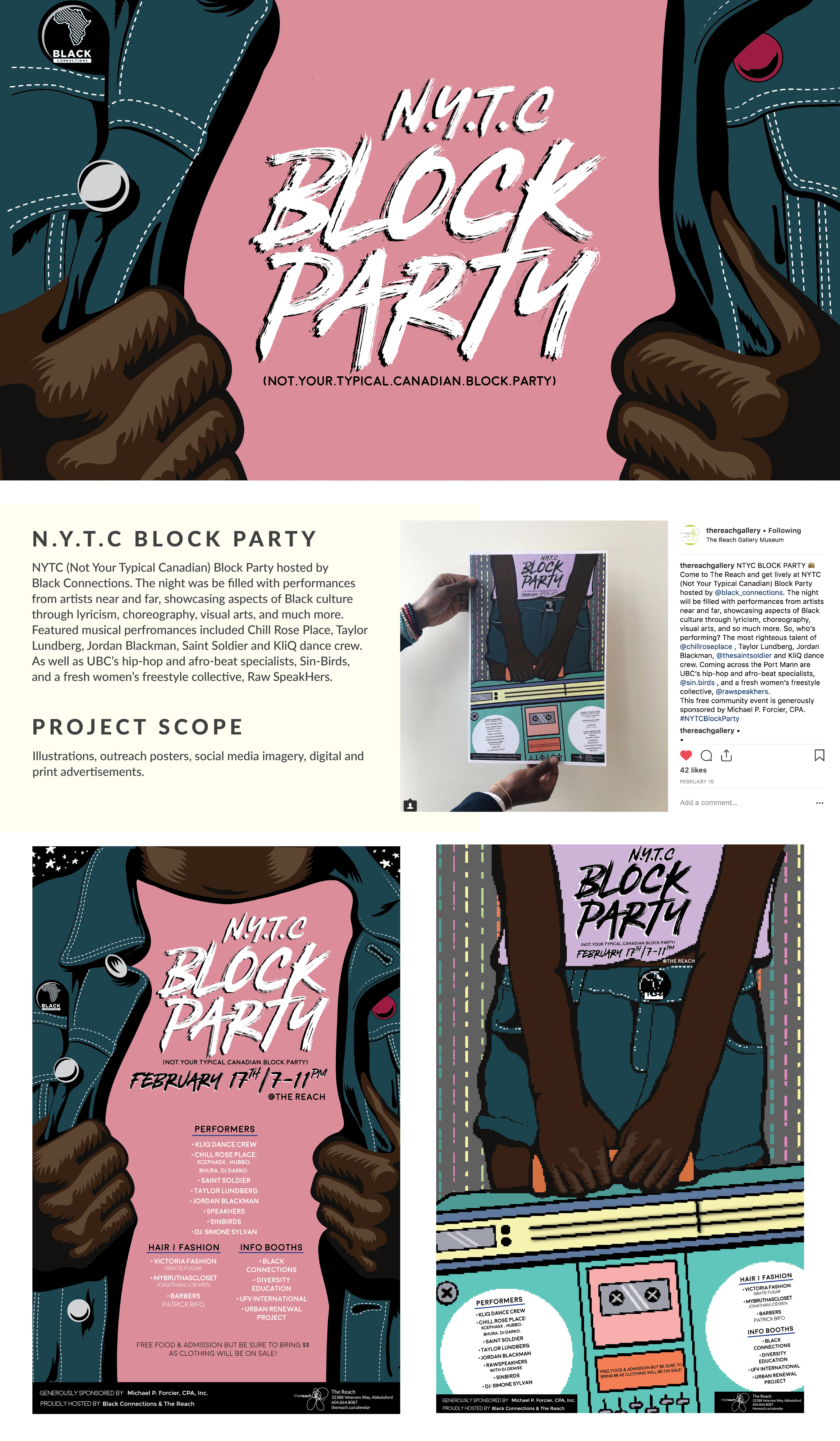 An illustration based project created for the branding of a Black Connections event held at The Reach Gallery Museum Abbotsford.