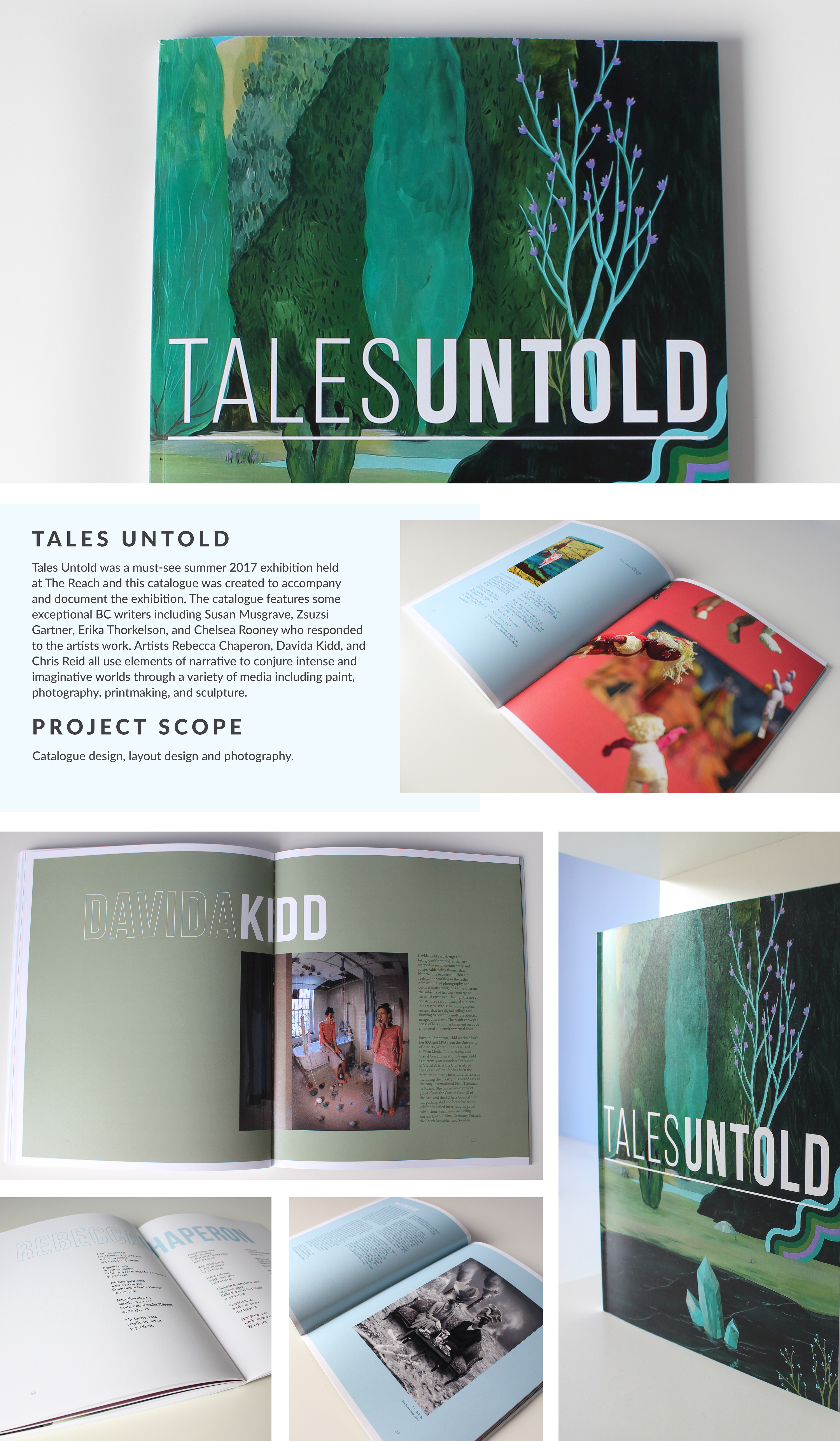 Exhibition catalogue design for Tales Untold. Created to document the exhibition as it was shown and curated by The Reach Gallery Museum Abbotsford
